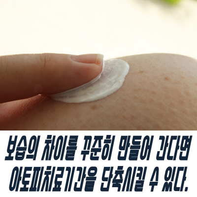 이외에도 샤워 후 3분 이내 보습하기, 아토피가 어느 정도 회복한 다음에는 보습 횟수를 점차적으로 1회로 줄이기, 로션보다는 크림으로 바르기 등 보습에도 섬세한 차이를 꾸준히 만들어 간다면 아토피치료기간을 단축시킬 수 있다.